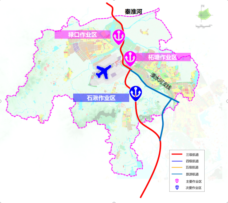 临空经济区形成“一干一支多点”的内河航道网布局,完善水路货运的同时,兼顾秦淮河水上游览功能。