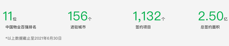 截止2021年6月已布局全国156个大中型城市,合约面积超过2.5亿平方米,管理涵盖住宅、商业、写字楼、园区、医院、学校、公建等综合业态。