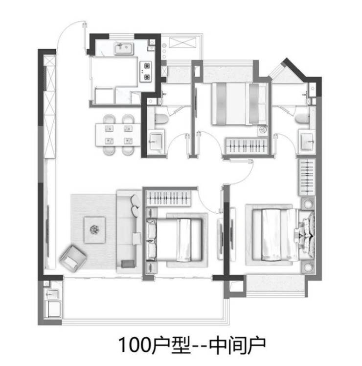 户型亮点分析:建筑面积约100㎡的三房两厅两卫户型,三开间朝南,采光面大,整体南北通透,空间灵动;