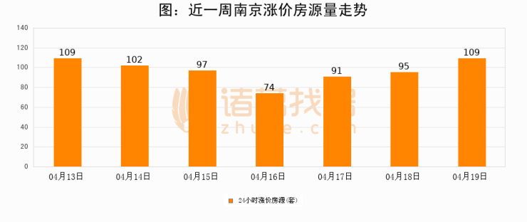 根据诸葛找房数据显示,南京24小时涨价房源量为109套,较04月18日增加14套,环比上涨14.7%。与此同时,涨价房源占比小幅扩大,业主信心有所提升。