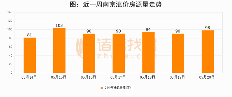 根据诸葛找房数据显示,南京24小时涨价房源量为98套,较05月19日增加8套,环比上涨8.9%。与此同时,涨价房源占比小幅扩大,业主信心有所提升。