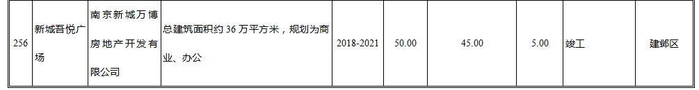 新城吾悦广场,工期2018-2021年,总投资50亿元,完成地下室施工,办公楼进行主体结构施工,今年预计竣工。