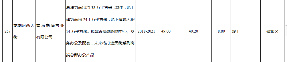龙湖河西天街,工期2018-2021年,建设高端购物中心、商务办公及配套,工期2018-2021年,总投资49亿元,主体施工,部分楼宇基本建成,今年预计竣工。