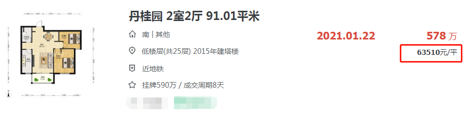 紧挨着项目的丹桂园,2014年开盘均价约2.7万/㎡,而该小区目前二手房挂牌均价在6.1万/㎡左右,较新成交的一套单价达6.35万/㎡,与开盘价相比涨了约3.6万/㎡!