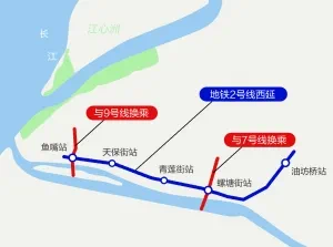 地铁2号线西延工程由既有2号线油坊桥站接出,沿莲花路南侧前行,后穿越绕城公路进入秦新路,沿秦新路向西分别在永初路路口设螺塘街站(可与7号线换乘),在青莲街路口设青莲街站,在天保街路口设天保街站,在头关街路口设终点站鱼嘴站(可与9号线换乘)。