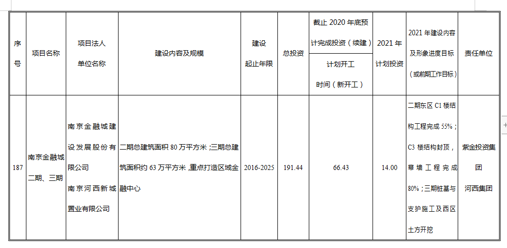 南京金融城二期、三期,其中二期主塔楼高度为416.6米;三期重点打造区域金融机构集聚中心,工期2016年-2025年,总投资191.44亿元,