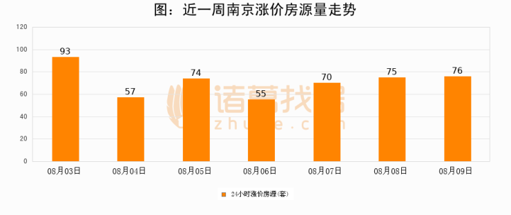 根据诸葛找房数据显示,南京24小时涨价房源量为76套,较08月08日增加1套,环比上涨1.3%。与此同时,涨价房源占比小幅扩大,业主信心有所提升。