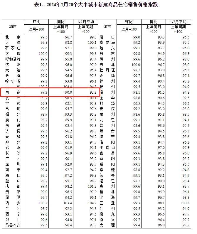 刚刚国家统计局发布《2024年7月份70个大中城市商品住宅销售价格变动情况》。