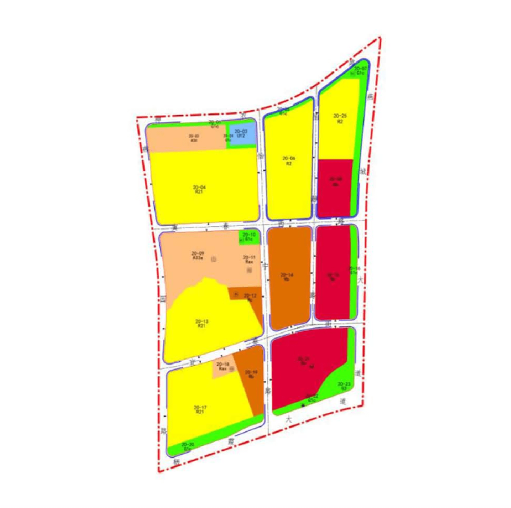 西侧20-06 地块用地性质由商住混合用地(Rb) 调整为二类居住用地(R2),容积率由<3.2 调整为2.5,建筑高度由<100 米调整为<80 米原20-08地块被调整切分为商办混合(20-08)和R2宅地(20-25)两个地块,其中商办用地要求,容积率<4.0,建筑高度<100 米,建筑密度<50%,绿地率230%;北侧R2宅地(20-25),容积率<2.5,建筑密度35%建筑高度<80 米,绿地率>30%。