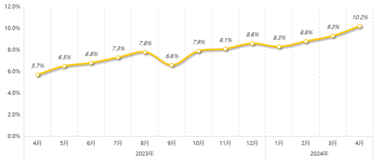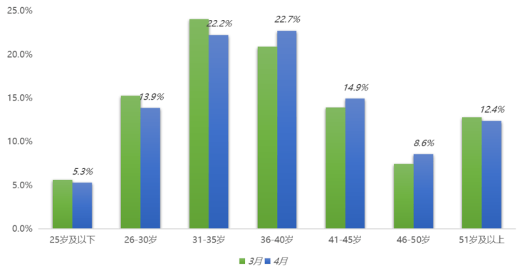 从成交年龄结构来看,4月35岁以上客群购房占比有所增加,累计占比达58.6%,增幅为3.5%;整体二手房市场仍是31-40岁中青年成交比重更高,累计占比44.9%。