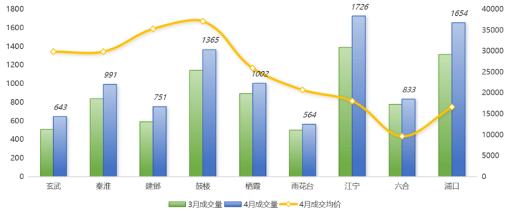 从各区成交来看,4月江宁成交1726套,排名全市第一;浦口紧随其后,成交量1654套;鼓楼成交1365套,仍位列第三,栖霞成交量也破千套。环比来看,各区成交量均有所上涨,江宁、浦口、建邺、玄武4区涨幅相对更高,超过了20%。