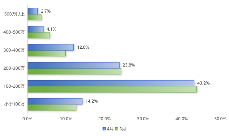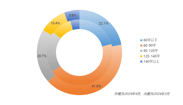4月,南京二手房需求面积段相对稳定,其中60-90平成交占比最高,比例达41%,60平以内占比22.1%,累计占比达63.1%。环比来看,4月大户型成交占比有小幅增加,涨幅较小,市场主流仍是2居、3居中小户型。