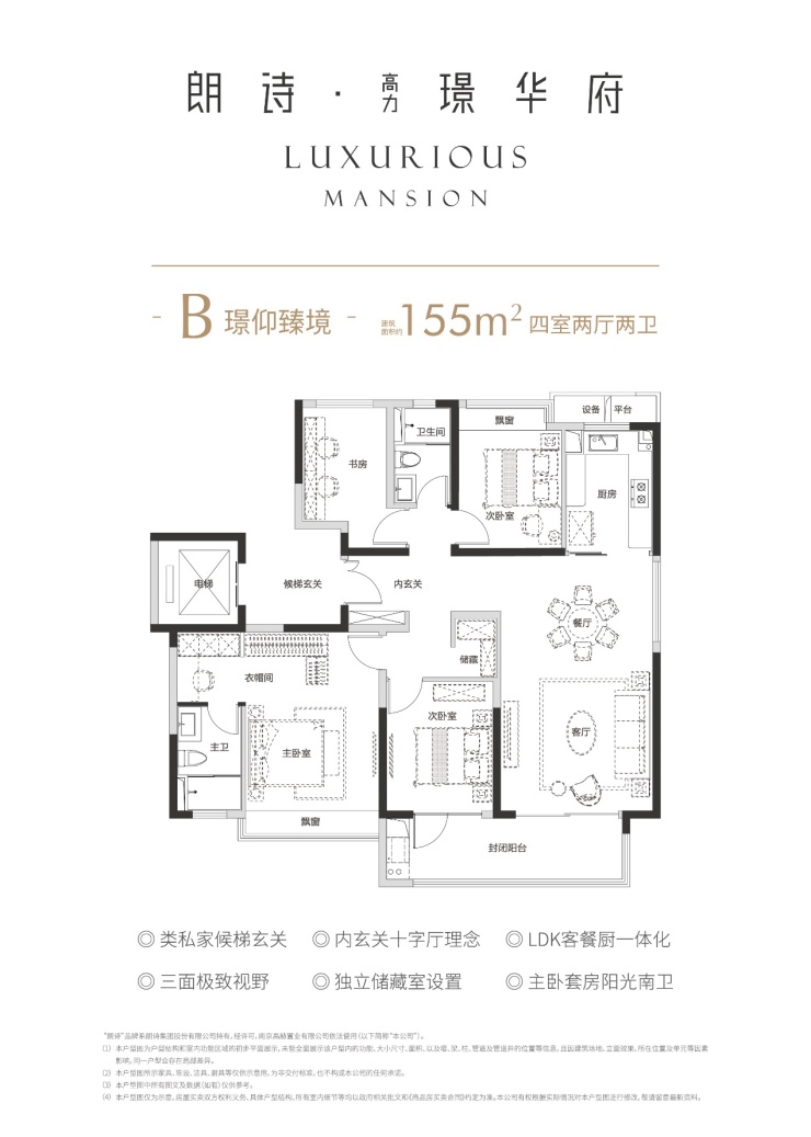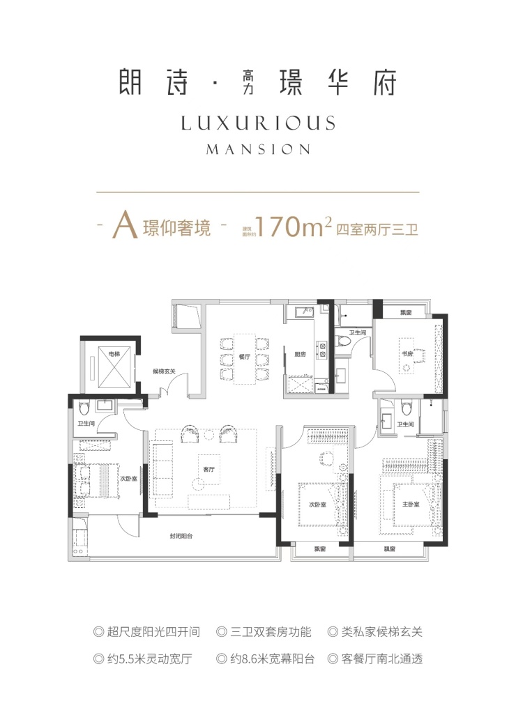 而在户型设计上,项目以纯粹圈层的考量为要点,打造主力户型为建面约155/170㎡健康堡垒,全4房大宅设计,让圈层纯度得到保持。在设计理念上,项目按家人集会的亲密性、个人生活的独处性,以及空间的智能化与细节化,进行深度的打造。较大约5.5米灵动宽厅、四开间朝南,搭配约8.6米宽幕双阳台,享受IMAX级超宽视野,结合高规双套房的设计,以宽尺境界、多维度全能空间,为每一个少有的大家族量身而来。