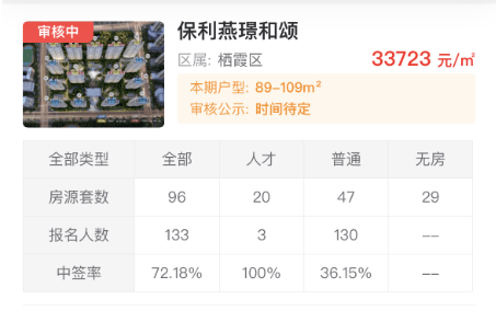 燕子矶的保利燕璟和颂新领了5#销许,共96套房源,户型建面约89、109㎡,全装修销许均价约33723元/㎡,另有3200元/㎡装修包可选。