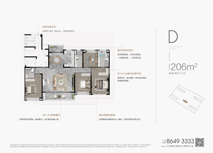 江尚紫薇此次加推的3#楼建面约206㎡户型,正北面就是小区的中心景观,两梯两户,一共就50套(含两套底跃),可见其纯粹性。除此,项目还是岛南在售新房中至今容积率最低的,建筑密度仅约16.97%,未来居住舒适度可见一斑。