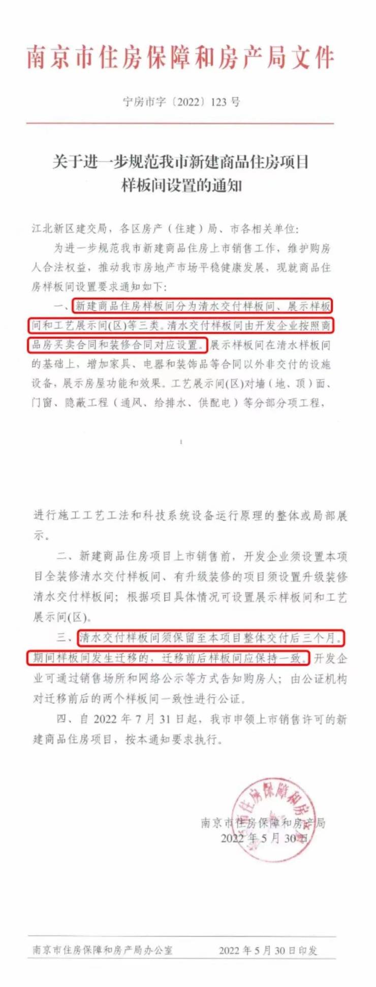 此前,南京对清水样板间的设置要求为“倡导”,而非强制性。此次较新文件要求:清水交付样板间必须保留至楼盘整体交付后三个月,期间样板间发生迁移的,迁移前后样板间应保持一致。开发企业可通过销售场所和网络公示等方式告知购房人;由公证机构对迁移前后的两个样板间一致性进行公证。