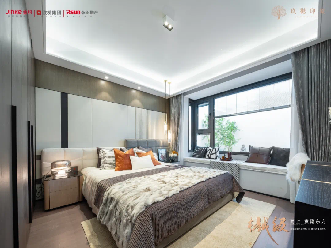南向主卧套房带飘窗,步入式衣帽间,干湿分离的独卫、带浴缸、淋浴和智能马桶等,在家也能享受到星级酒店的同等居住体验。