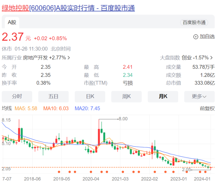 截至1月26日中午休市,绿地集团股价微涨0.85%,报2.37元。