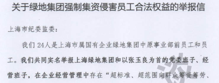1月25日下午,一份《关于绿地集团强制集资侵害员工合法权益的举报信》(以下简称举报信)在网络平台传播,举报人自称是24名绿地集团中原事业部的前员工,举报信的末尾留有个人签名、身份证和手机号码。