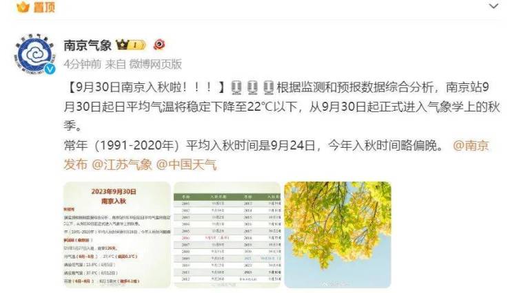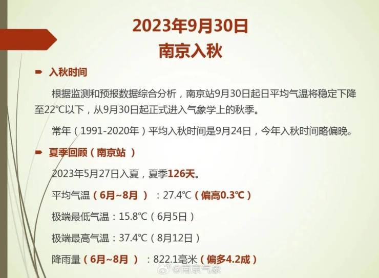 南京已于9月30日入秋根据监测和预报数据综合分析南京站9月30日起常年(1991-2020年)平均入秋时间是9月24日🍂 今天天气如何?一起来看全市今天下午多云到阴夜里阴,部分地区有阵雨明晨最低气温:15℃…