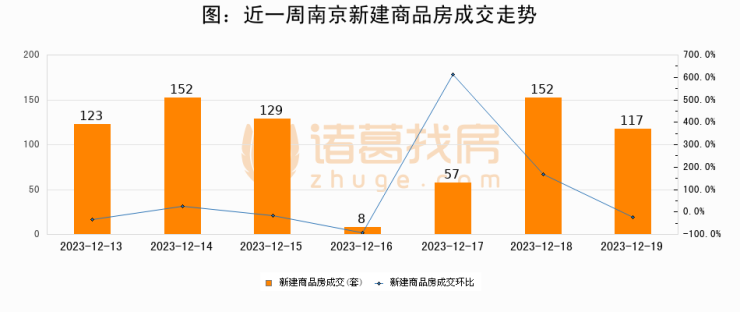 根据南京市住房保障和房产局数据显示,2023年12月19日南京新建商品房成交117套,较昨日减少35套,环比下降23%