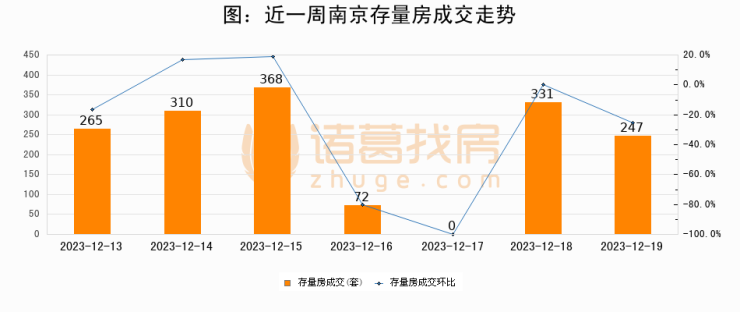 从存量房来看,2023年12月19日南京存量房单日成交247套,比昨日减少84套,环比下降25.4%。从近一周存量房成交来看,南京存量房日均成交套数为227套,12月19日单日成交247套,高于近一周平均水平8.8%。