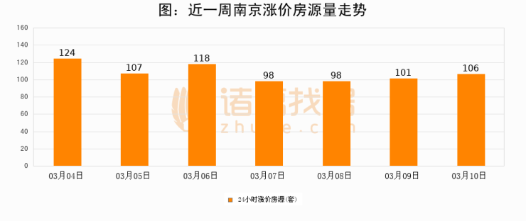 根据诸葛找房数据显示,南京24小时涨价房源量为106套,较03月09日增加5套,环比上涨5%。与此同时,涨价房源占比小幅扩大,业主信心有所提升。