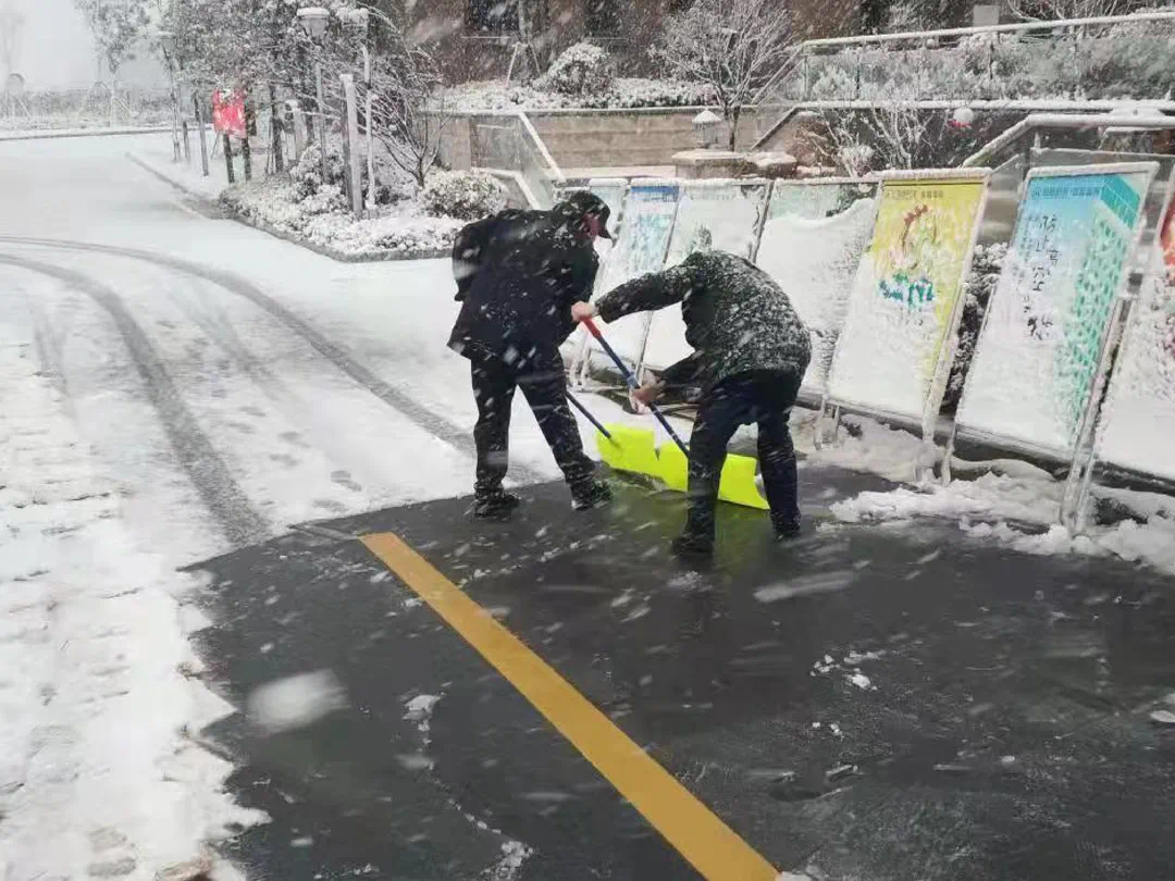雪景虽美,却是积雪积冰的危险信号。为全力保障广大业主的出行安全,物业团队立即启动雪天应急预案,迅速组织铲雪除冰行动。天刚蒙蒙亮就全员出动,不畏严寒,相互配合,挥舞着铁锹,铲雪除冰。