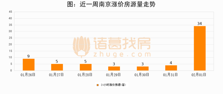 根据诸葛找房数据显示,南京24小时涨价房源量为34套,较01月31日增加30套,环比上涨750%。与此同时,涨价房源占比小幅扩大,业主信心有所提升。