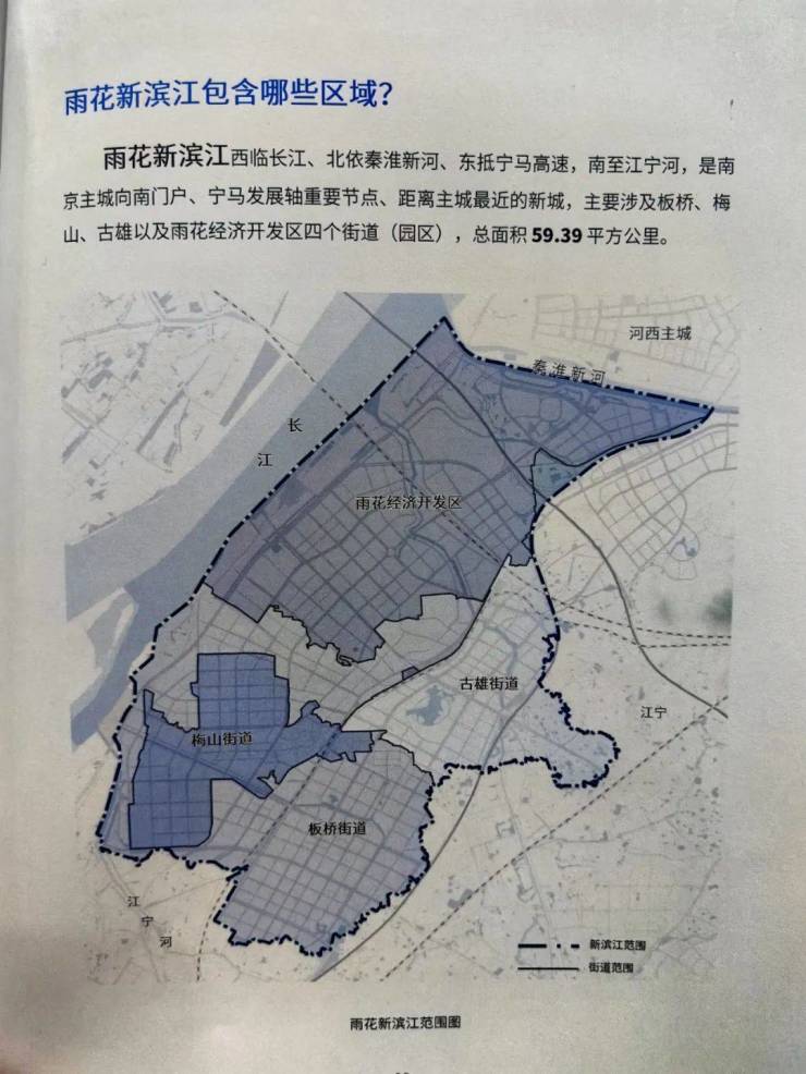雨花新滨江西临长江、北依秦淮新河、东抵宁马高速,南至江宁河,是南京主城向南门户、宁马发展轴的重要节点、距离主城最近的新城,主要涉及板桥、梅山、古雄以及雨花经济开发区四个街道(园区),总面积59.39平方公里。