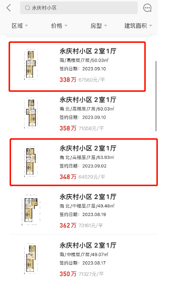 成交价都在7万+的永庆村小区在9月接连卖出两套单价仅有6万+的房源。