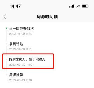 更为关键的是,这套房源于9月21日挂牌,一开始挂牌价格为780万,就在挂牌9天后,直降330万,将挂牌价调整为450万,中介昨天才拿到钥匙,一天已经带看42次。