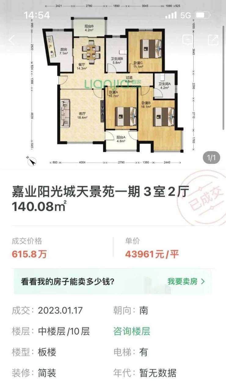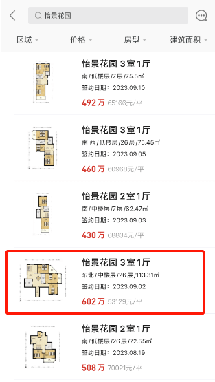 看房哥也查到,小区内同户型房源在今年1月的时候成交总价是615.8万,折合单价43961元/平。