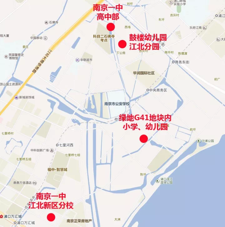 目前已经引进了鼓幼江北分园、书人幼儿园、南京一中江北新区分校、南京一中高中部、托马斯实验学校等。