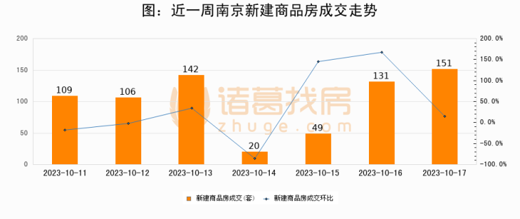 根据南京市住房保障和房产局数据显示,2023年10月17日南京新建商品房成交151套,较昨日增加20套,环比上涨15.3%