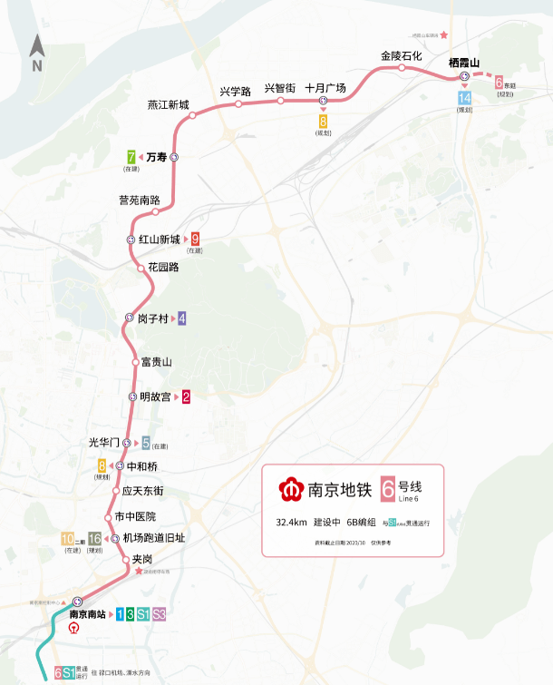 南京地铁6号线全长32公里,共设车站19座,北起栖霞山站,途经栖霞区、玄武区、秦淮区、雨花台区和江宁区,串联起栖霞山、南京经济技术开发区、燕子矶、黑墨营、紫金山、光华门、南部新城地区,南至南部新城的南京南站,是串联南京主要商务及旅游的规划性辅助轴线。