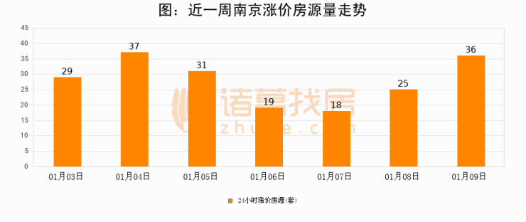 根据诸葛找房数据显示,南京24小时涨价房源量为36套,较01月08日增加11套,环比上涨44%。与此同时,涨价房源占比小幅扩大,业主信心有所提升。