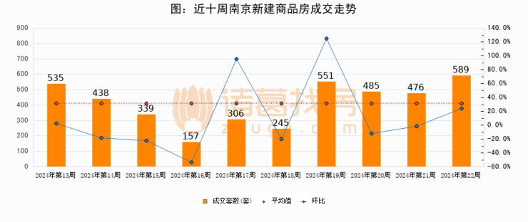 进入2024年第22周(05月27日-06月02日),南京新建商品房成交589套,较上周增加113套,环比上涨23.7%