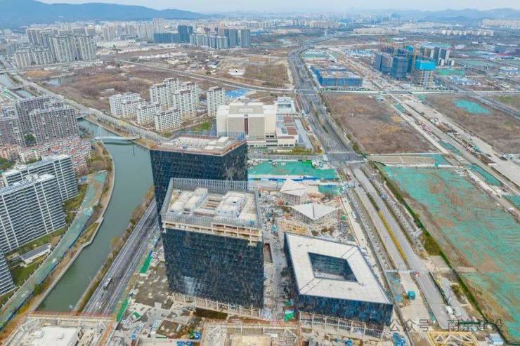 进入施工区域可以看到,三栋建筑的外立面幕墙施工已基本完成。外立面以锯齿状的造型为主要元素,通过三种三角形模块的不同组合,且各层之间形成有波动的韵律,由此最终形成整个外立面的造型,与“破冰”的意象相呼应。