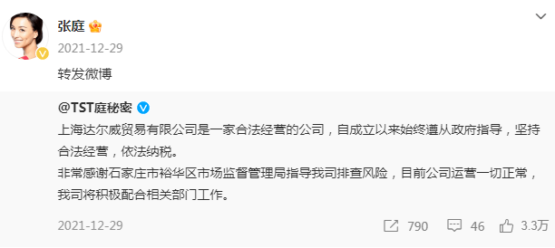 2021年12月29日凌晨,“TST庭秘密”官方微博回应称,上海达尔威是一家合法经营的公司,自成立以来始终遵从政府指导,坚持合法经营,依法纳税;非常感谢河北石家庄政府指导公司排查风险,目前公司运营一切正常,公司将积极配合相关部门工作。当日张庭通过个人微博转发了上述声明。