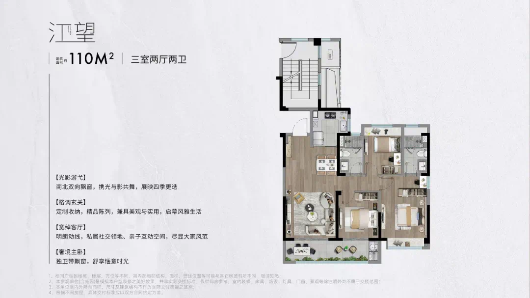 越江时代位于江北核心区的青奥板块,由招商蛇口、新城、弘阳、新希望联合打造,由弘阳物业管理服务。项目打造12栋24-27层的高层住宅,社区内部自带约3800㎡集中商业体,另规划一栋写字楼。