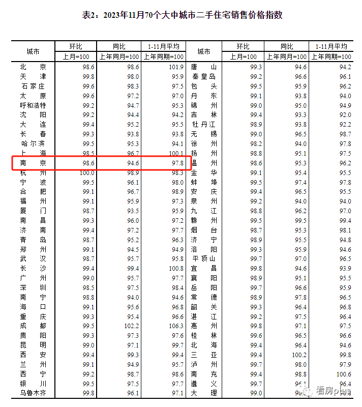 今天上午,国家统计局最新发布了2023年11月份70个大中城市商品住宅销售价格变动情况统计数据。其中,11月南京新房价格环比下跌1%、同比下跌2%,二手房价格环比下跌1.4%,同比下跌5.4%。