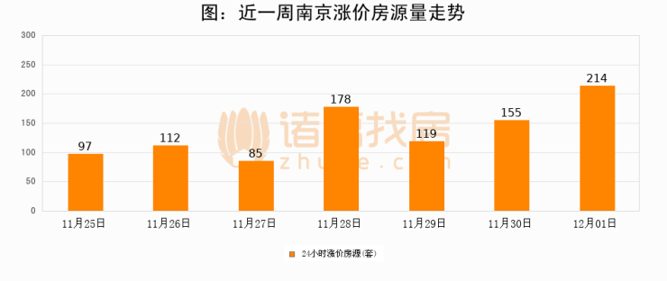 根据诸葛找房数据显示,南京24小时涨价房源量为214套,较11月30日增加59套,环比上涨38.1%。与此同时,涨价房源占比小幅扩大,业主信心有所提升。