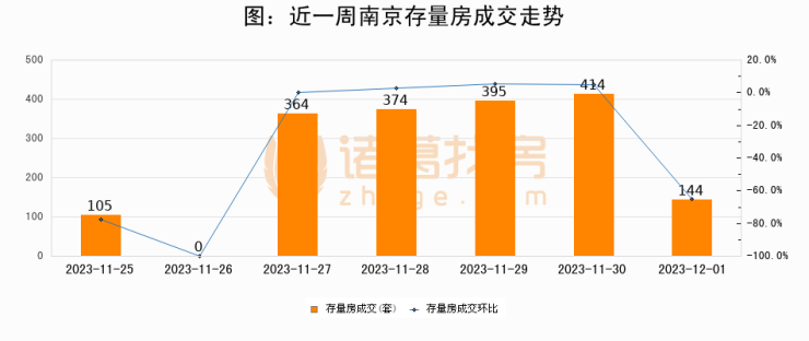从存量房来看,2023年12月01日南京存量房单日成交144套,比昨日减少270套,环比下降65.2%。从近一周存量房成交来看,南京存量房日均成交套数为256套,12月01日单日成交144套,低于近一周平均水平43.8%。