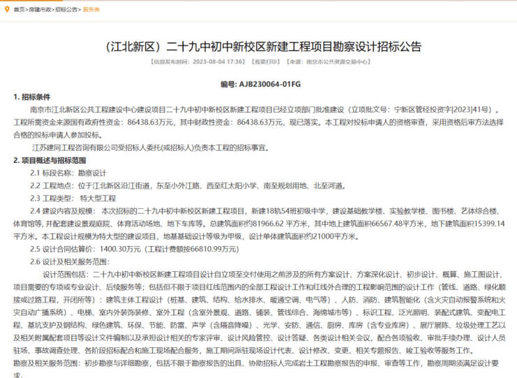 近日,南京公共资源交易中心发布了江北新区29中初中新校区新建工程项目勘察设计招标公告。