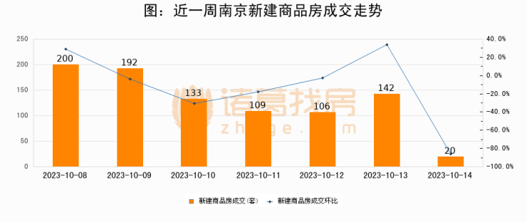 根据南京市住房保障和房产局数据显示,2023年10月14日南京新建商品房成交20套,较昨日减少122套,环比下降85.9%