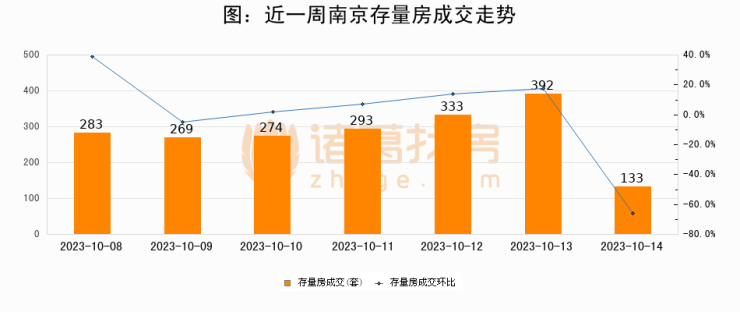 从存量房来看,2023年10月14日南京存量房单日成交133套,比昨日减少259套,环比下降66.1%。从近一周存量房成交来看,南京存量房日均成交套数为282套,10月14日单日成交133套,低于近一周平均水平52.8%。