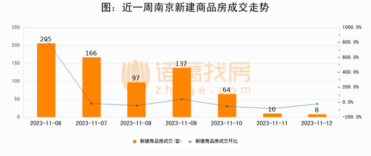 根据南京市住房保障和房产局数据显示,2023年11月12日南京新建商品房成交8套,较昨日减少2套,环比下降20%