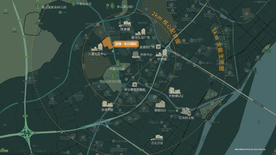 金隅紫京叠院就位于江北老山板块,紧靠江北核心区,半径5公里内繁华生活圈,满足生活所有需求。