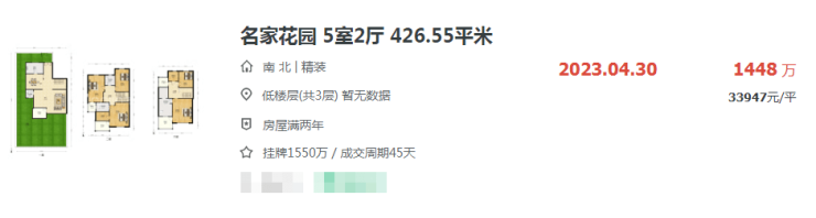 江宁三山板块名家花园成交了一套户型建面约426.55㎡户型,成交总价1448万,折合单价约33947元/㎡,成交周期也不长,45天。